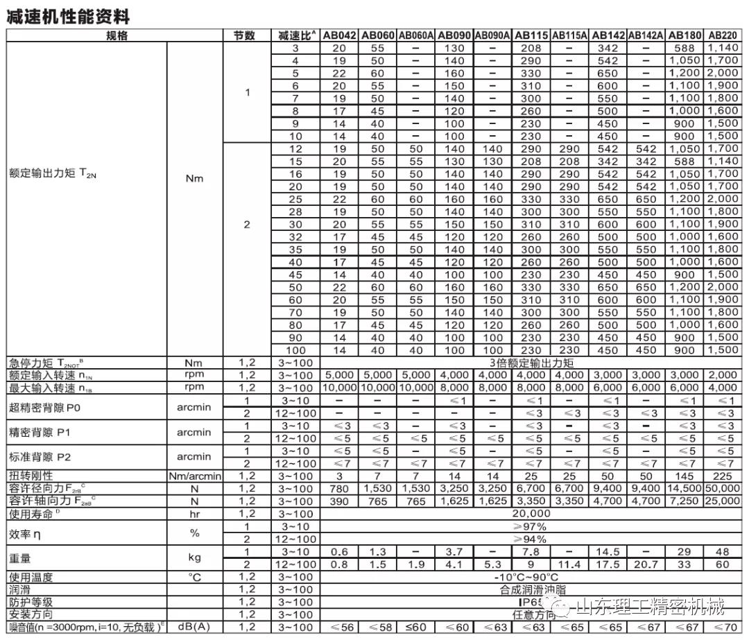 例如上圖的樣本中,減速機(jī)的型號為:AB042-單節(jié),我們在選擇的時候,需要注意幾個地方,第一就是看減速機(jī)的外形,例如上式中的042,其實外形尺寸為42*42mm,這個時候注意去和你的伺服電機(jī)的外形做比較,通常我們選擇外形相當(dāng)?shù)臏p速機(jī)就可以了。